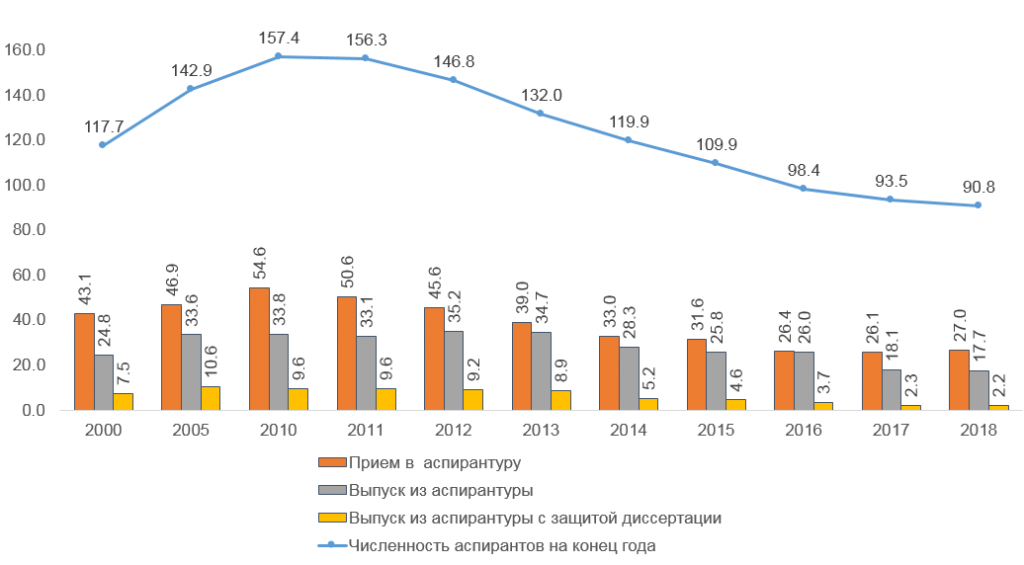 Отмечается снижение эффективности работы аспирантуры: в 2018 году удельный вес защитивших кандидатскую диссертацию в период подготовки в общем выпуске аспирантов составил лишь 12,4%, тогда как в 2000—2013 годах этот показатель варьировался от 24 до 33,5%. В научно-исследовательских организациях доля выпущенных с защитой диссертации снизилась за 2000—2018 годы с 22,9 до 10,3%, в образовательных организациях высшего образования — с 31,5 до 12,7%.