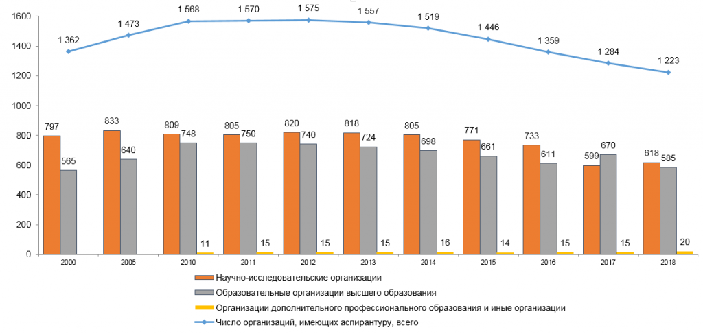 В 2018 году подготовку аспирантов осуществляли 1223 организации, в том числе научно-исследовательские (50,5%) и образовательные организации высшего образования (47,8%). Кроме того, с 2009 года программы аспирантуры реализуют организации дополнительного профессионального образования, а с 2018-го — и иные организации. За период 2000—2018 годов общее число организаций, имеющих аспирантуру, уменьшилось на 10,2% за счет существенного сокращения их числа среди научно-исследовательских организаций. Это обусловлено вступлением в силу Федерального закона от 29 декабря 2012 года № 273-ФЗ «Об образовании в Российской Федерации», согласно которому аспирантура стала третьей ступенью высшего образования, что повлекло за собой ужесточение требований к организациям и, как следствие, закрытие ряда аспирантских программ.